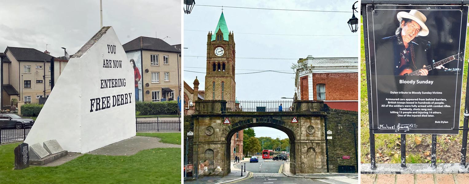 Der „Blutsonntag“ ist in die Geschichte Derrys eingegangen als Erinnerung an eine blutige Ausei-nandersetzung im Januar 1972 zwischen unbewaffneten Demonstranten und englischen Soldaten. 1998 wurde dann mit dem „Karfreitagsabkommen“ Frieden geschlossen. Man konnte die hohen Stadtmauern begehen, die fast alle im Original erhalten sind.