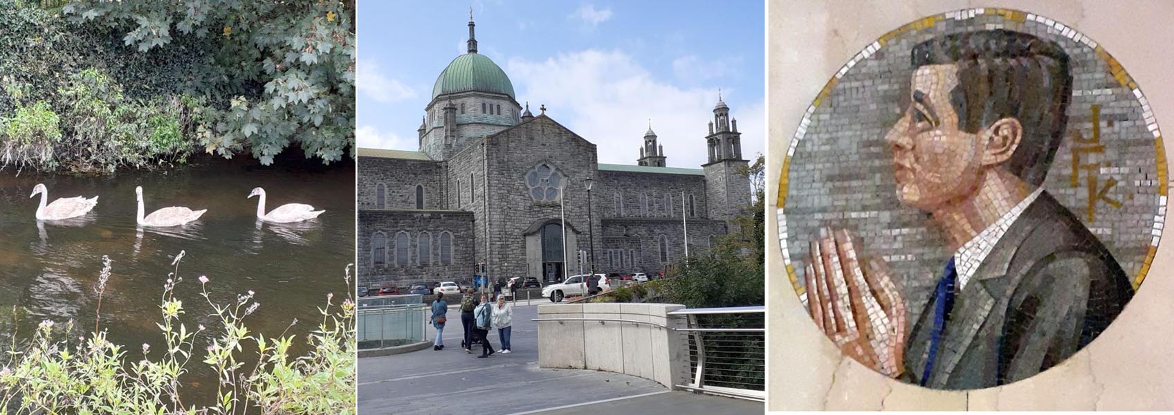 Nachmittags, bei schönstem Wetter, gingen die meisten Gäste entlang der schönen Flusspromena-de bis zu der Kathedrale Maria Himmelfahrt und St. Nicolaus, einem imposanten Gebäude, geprägt von mehreren Baustilen mit einer Besonderheit: statt eines Heiligenbildes ein Mosaikbild von John F. Kennedy. Im Juni 1963 besuchte der US-Präsident nämlich die Insel Irland und Galway. Sein Urgroßvater stammte aus Irland. Das Mosaikbild mit dem Kopf von John F. Kennedy erinnert an dieses Ereignis.