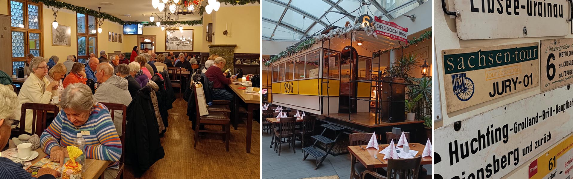 Eine kurze Pause machte es möglich, dass man regionale Produkte wie Christstollen, Adventskalender etc. kaufen konnte. Ein letzter Abstecher führte an der am 09.11.2024 eingestürzten Carolabrücke vorbei. Im Restaurant Dresden 1900 an der Frauenkirche, wartete schon ein Kaffeegedeck mit Eierschecke, einer sächsischen Kuchenspezialität, auf uns.