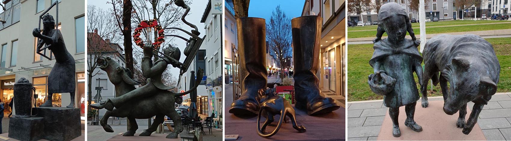 Auf ihm sind Skulpturen berühmter Märchen der Brüder Grimm dargestellt – vom Rotkäppchen über den gestiefelten Kater bis zu Schneewittchen. Nach dem Stadtrundgang waren wir hungrig und