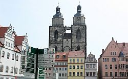Am Donnerstag 23. Mai war das Tagesziel die Lutherstadt Wittenberg. Der Himmel war wieder blau, die Sonne schien und es war warm. Heute waren 14 Radfahrer unterwegs und 10 Nicht-Radfahrer. Während die Nicht-Radfahrer Wittenberg direkt ansteuerten, fuhren die Radfahrer zunächst mit dem Auto und den Fahrrädern an Bord auf den Großparkplatz in Wörlitz, um dort auf das Rad umzusteigen. Zunächst ging die Radtour zur Fähre Coswig, mit der wir über die Elbe übersetzten. Dann ging die Fahrt weiter auf dem Elbe-Radweg durch wunderschöne Elbeauen nach Wittenberg. Hier trafen wir auf die Nicht-Radfahrer, die am Vormittag das Panometer besucht hatten, das 360°-