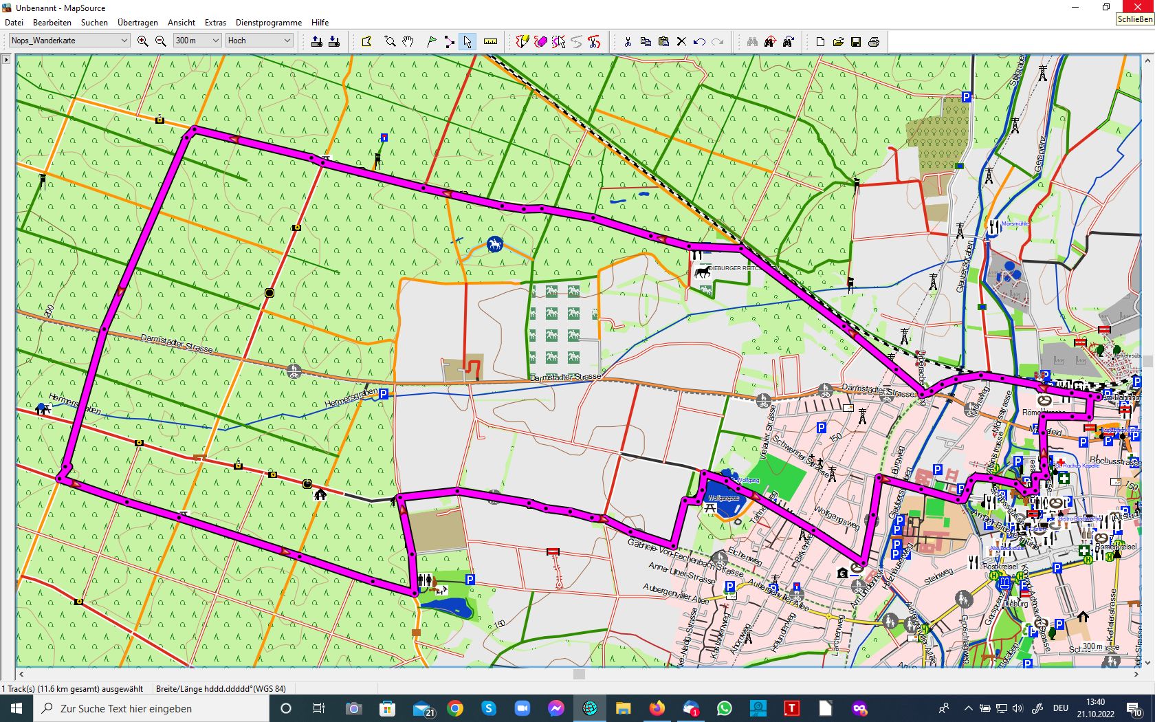 Strecke: Rundwanderweg; zunächst vom Bahnhof aus westwärts auf dem Fuß-/Radweg neben den Gleisen entlang und dann über den Messeler Weg in das Waldgebiet ostwärts des Mainzer Bergs. Rückzus an zwei Seen vorbei zum Dieburger Martinsmarkt.